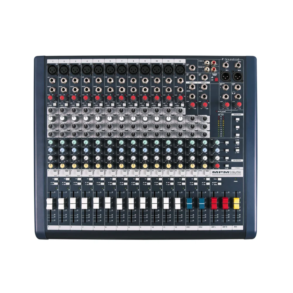 Soundcraft MPMi 12/2 La Soundcraft MPMi 12/2 es una mesa de mezclas analógica de alto rendimiento, ideal para aplicaciones en vivo, instalaciones fijas, casas de culto y producción musical. Equipada con 12 entradas mono con preamplificadores GB30 y 2 entradas estéreo, ofrece una respuesta en frecuencia de 20 Hz a 20 kHz ±1.5 dB, asegurando una reproducción precisa del sonido. Cuenta con 3 buses auxiliares, dos de ellos conmutables entre pre y post-fader, y una tercera salida auxiliar para efectos externos. Su construcción robusta y controles bien distribuidos garantizan facilidad de uso y mantenimiento. Con una potencia de consumo inferior a 40 W y una temperatura de operación de 5°C a +40°C, es una opción confiable y versátil para profesionales del audio.